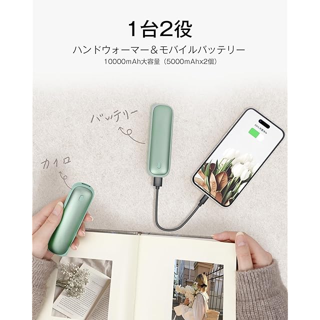 【1台2役・モバイルバッテリー機能搭載】ハンドウォーマーとしてだけでなく、10000mAhの大容量バッテリーを搭載したモバイルバッテリーとしても利用できます。スマートフォンやワイヤレスイヤホンなど、2つのデバイスを同時に充電することができ、特に寒い環境で長時間外出する際に便利です。また、移動中にバッテリーが切れてしまう心配もなく、いつでも手元に電力を確保できるので、外出時の安心感が違います。