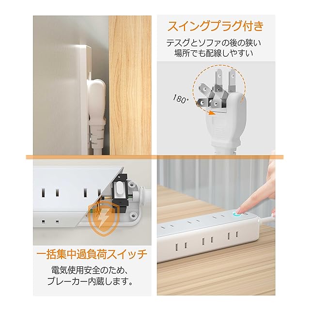 「安全性ある·タコ足配線」:一括集中スイッチ付きで、接続した機器の電源をまとめてON/OFF可能です。ブレーカー内蔵で消費電力オーバーになるとブレーカーが作動し電源が切れるので安心です。それに、電源確認ライト付き、通電中かは一目瞭然。