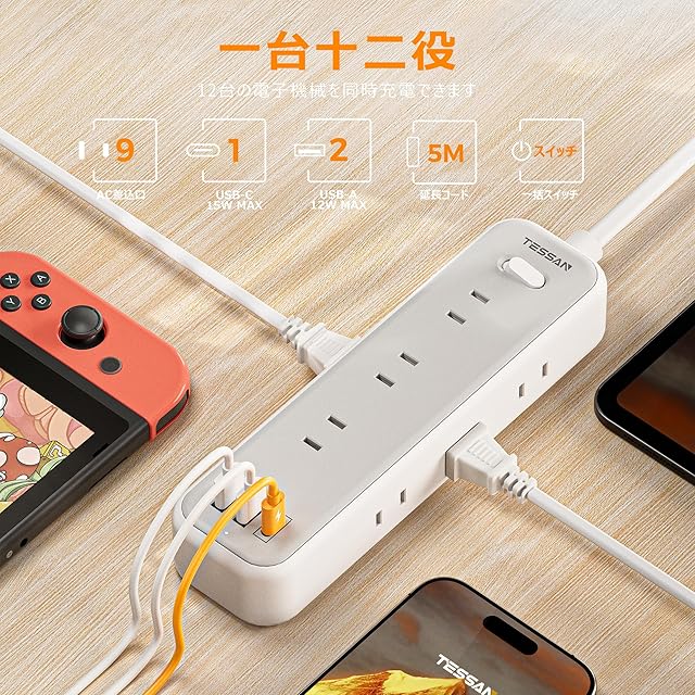 延長コード 5m 電源タップ usb-c たこあしコンセント テーブルタップ TESSAN 9個AC口 1個タイプCポート 2個USBポート 電源コード OA type-c タコ足配線 マルチ 一括スイッチ 壁掛け 卓上