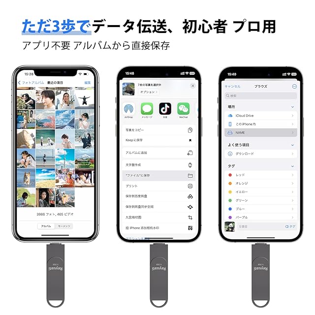 【4in1 多機種対応・専用アプリ必要なし、安心安全usbメモリ】当社のusbメモリは専用アプリ必要なくて、Ap社の「ファイル」を使用して、phone データ直接保存可能です。他社の専用アプリ必要usbメモリに比べて、アプリのダウンロードの邪魔がなくて、phone・iPadのデータが直接バックアップ可能、もっと便利、安心安全!さらに、IOS・USB-A・USB-C端子が4 IN 1で、幅広いデバイスを対応可能で、データ転送、phone・iPad容量不足、簡単に解消出来ます。
