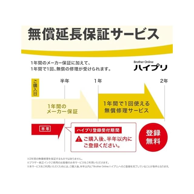 登録設定をすることでブラザーのポイントサービス「トク刷るポイント」が利用できます。また、登録するだけで、メーカー1年に加えて、1年間に1回使える延長の無償修理サービス「ハイプリ」が利用できます。※2年間の無償修理をするものではありません。※ブラザー純正インクご使用のお客様のみ対象。※プリンター本体をインターネットに接続できるネットワーク環境(有線LAN/無線LAN)でご使用することが条件となります。(プリンター本体にUSBケーブルのみを接続してご使用している場合は、本サービスはご利用いただけません。)※本サービスをご利用いただくためには、ご購入後、半年以内にBrother Online「ハイプリ」へのご登録を完了していることが条件となります。