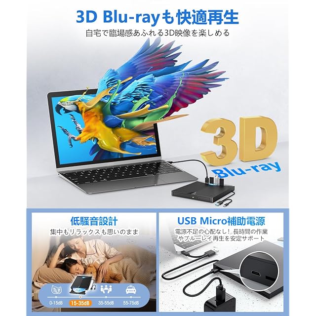 【外部電源不要・安定駆動】 本 外付けブルーレイドライブ はUSBバスパワー駆動に対応しており、面倒な電源接続は不要。PCに差し込むだけで簡単に使用できます。さらにMicro補助電源ポートを搭載しているため、電力不足が心配なときでも安定した動作を実現。長時間の映画視聴や連続データ書き込み時も安心してお使いいただける ブルーレイドライブ です。