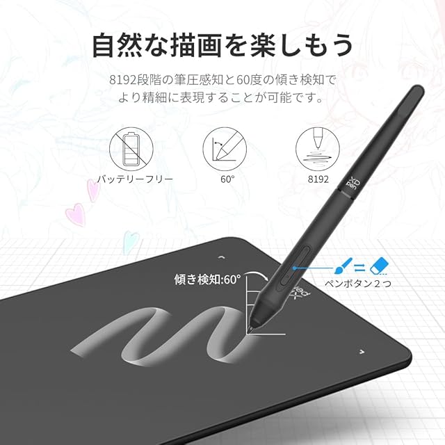 【ペンタブ仕様】作業エリア:10×6.25インチ、重さ570g、カスタマイズ可能な8つのショットカットキーを搭載。同梱のバッテリーフリースタイラスペンは、60度の傾き検知機能と8,192レベルの筆圧感度を備え、精緻なスケッチと線画のための、より高い精確性、コントロール力、流動性を提供します。