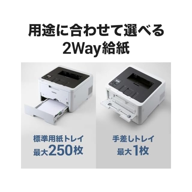 最大用紙サイズ:A4、最大給紙枚数:標準用紙トレイ250枚、手差しトレイ1枚
