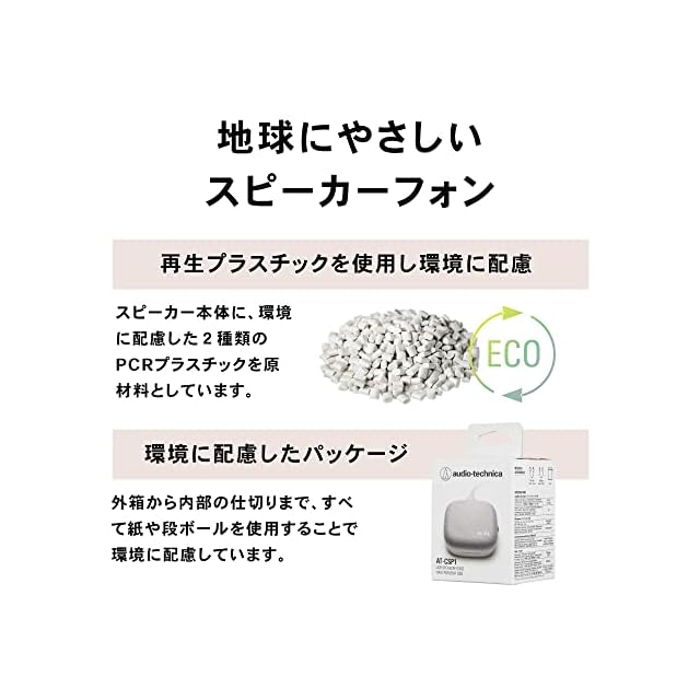 【地球にやさしいスピーカーフォン】再生プラスチックを使用したスピーカーフォン。スピーカー本体に、再生プラスチックを50~70%配合。環境に配慮した2種類のPCR Post-Consumer Resin)プラスチック*を原材料としています。 * PCR プラスチックは、私たちが消費したペットボトルやその他のプラスチックなどをリサイクルした材料です。地域のリサイクルプログラムなどを通じて入手しやすく、より少ないエネルギーと化石燃料で再利用が可能なため、埋め立て地に送られる廃棄物の量を減らすことができます。