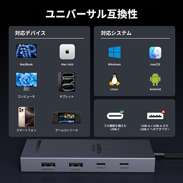 【幅広い互換性・USB-C対応機器に最適】この 8-in-1 USB-Cハブは、MacBook Pro、MacBook Air、MacBook M1、M2、M3、M4、iMac、iPad Pro、iPhone 15 Pro/Pro Max、Chromebook、Surface、Switch、Steam Deck、Rog Allyなど、ほとんどのUSB-C機器と互換性があります