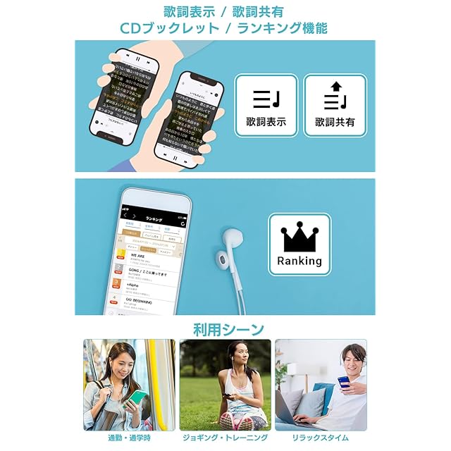 【iPhoneとAndroid内の音楽も聴ける】本製品で取り込んだ曲だけでなく、iTunes音楽データやAndroid端末に入っている音楽も聴くことができます。また、歌詞表示機能付きで歌詞も楽しめるので、音楽プレイヤーとしてぴったりです。 ※歌詞表示機能を使うにはインターネットの接続が必要です。