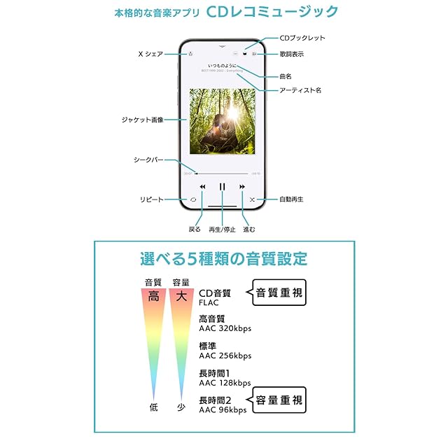 【選べる5種類の音質設定】標準音質(256kbps)を含め、5つの音質設定がありますので、用途に応じてCDを取り込むことができます。例えば、CD音質をスマホで聴きたい時はFLACを選択、スマホの容量を節約したいときは、長時間2(AAC96kbps)を選択できます。