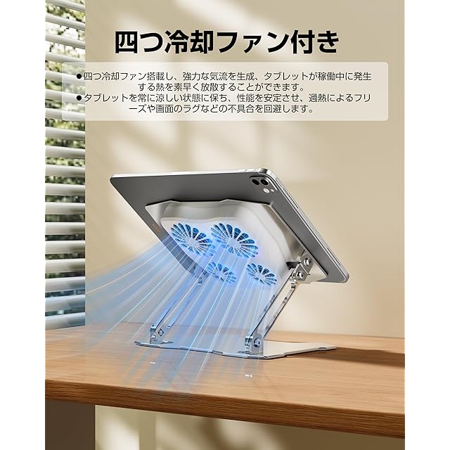 タブレット 冷却スタンド アルミ合金製 iPad冷却台 四つ冷却ファン付き 2つUSBポート付き 折りたたみ式 低騒音 角度無段階調整 姿勢改善 滑り止め付き Switchゲーム機対応