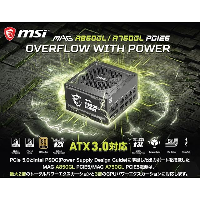 商品名:MSI MAG A850GL PCIE5 PC電源ユニット 850W ATX3.1/PCIe 5.1対応 80PLUS GOLD認証 フルモジュラー 7年 PS1327