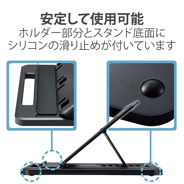 折り畳みが可能で取っ手付きのため、収納や持ち運びに便利です。 ホルダー部分とスタンド底面にシリコンの滑り止めが付いているため、安定して使用できます。