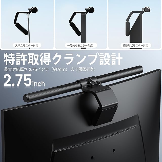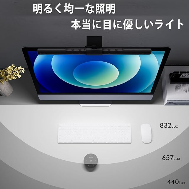【モニター反射ゼロの光学設計で作業に集中】 特殊な非対称配光技術を採用しており、モニターの画面への反射を完全に防止します。これにより、画面の視認性が向上します。モニターの上部に簡単に取り付けることができ、デスク全体を均等に照らしながら、画面の明るさを均一に保ちます。長時間の作業やゲームにも最適で、集中力を高める明るさを提供します。