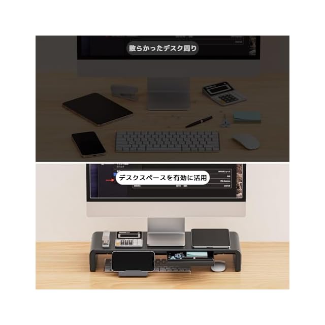 有効なスペースを向上させ:スタンドの下にキーボードやマウス、ゲーム機やノートパソコンなどを収納できるスペースがあります。また、引き出し、スマホやタブレットスタンドも付いているので、デスク周りをキレイに整理し、スペースを有効活用できます。