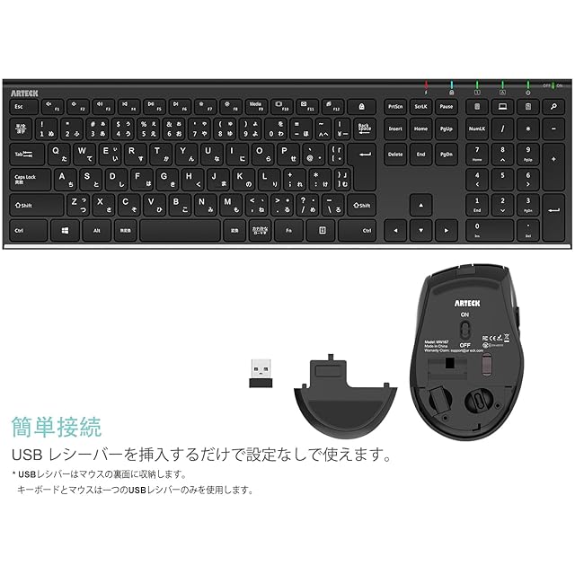 【共用USBレシバー】 キーボードとマウスは一つのレシーバーを共用します。