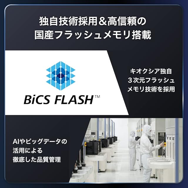 【特徴】国内メーカーであるKIOXIA独自の国産BiCS FLASH搭載。信頼性向上と低消費電力化を実現。