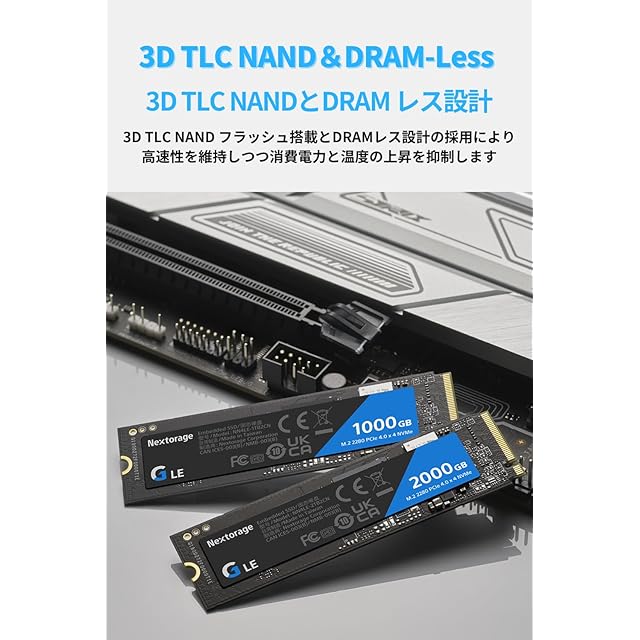 Nextorage Gシリーズ LE|M.2 2280 PCIe 4.0 NVMe Gaming SSD は、ソニー20年のメモリストレージの歴史を受け継ぐ技術者とスタッフによって作られた日本メーカー「Nextorage」によって作られた内蔵SSDです。製品をご購入後5年間の製品と国内サポートに対応しているため、安心してご購入いただくことができます。インターフェースがNVMe (PCIe Gen4 x 4)、 フォームファクタがM.2 2280のこの製品は、、ゲーマー、ハイエンドユーザー、クリエイター、自作PC、容量増設など幅広い用途に対応した日本の技術者により設計されたSSDです。スピードと安定性を追求したこの進化型SSDは、最新世代のコントローラーと3D TLC NANDフラッシュの搭載、そしてDRAMレス設計の採用により長時間の利用にも耐える安定性を確保し、ハイエンドゲームや4K以上の高解像度動画編集といった高負荷を要する作業においても、卓越したパフォーマンスと快適性を提供します。M.2 SSD GシリーズLEを増設することで、高速ローディング、ラグや処理落ちの軽減、強化された安定性により、ゲーミングPCの性能を最大限に引き出すことができます。また、大容量ダイナミックSLCキャッシュ、ウェアレベリング機能、エラー訂正アルゴリズム(LDPC)により、パフォーマンスとメモリ寿命の両方が向上しました。本製品は機能のテストに加え、出荷前に当社規定の高温環境下で全領域での書き込み/読み出しテストを実施済です。