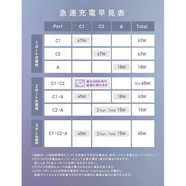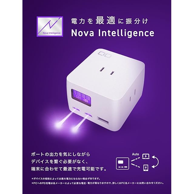 【CIO独自制御技術 NovaIntelligenceを搭載】3台同時充電時はデバイスにあった電力を自動で振り分け、端末に合わせて自動で調整してくれるNovaIntelligence(ノヴァインテリジェンス)を搭載。ポートの出力を気にしながらデバイスを繋ぐ必要がなく、同時充電時もストレスなく快適に充電が可能です。合計65Wまでの高出力で、スマホからノートPCの充電まで対応。 ※高出力充電には対応したケーブルが必要です。 ※デバイスによっては充電できない規格もございます。