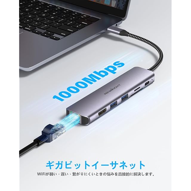 【7-in-1 usb c ハブ lan マルチポート】typec ハブ lan 7-in-1は(4K HDMIポート*1、USB-C充電ポート*1、SDカードスロット*1、TFカードリーダー*1、USB 3.0ポート*2、ギガビットイーサネットポート*1)があり、Newmight usb-c ハブはノートパソコンにUSB Cポートが1つしかない問題を完璧に解決し、USBポートに挿すだけですぐに使え、初めて使用する人でも安心使用できるusb c ハブ lan hdmiです。