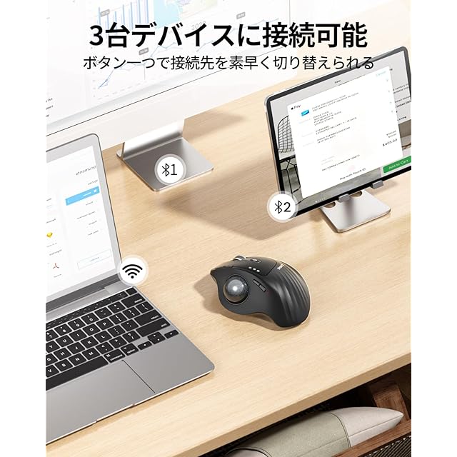 移動エリアが必要ない無線マウス 充電式トラックボールマウスのボールの移動が滑らかな上、机の上でマウスを移動する必要が無いので、占有場所は圧倒的に小さいです。ワイヤレスタイプなので、可搬性にも優れていています。有線マウスや普通のマウスと違い、机やソファー、寒い時、布団やこたつの中でくつろぎながらパソコンを操作できて、マウスパッドも不要です。。狭いところでも、楽に使えるデスクワークのユーザーの強い仲間です。