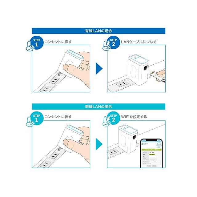 お手持ちの機器にIDを登録しておけば、コンセントに挿し、LAMケーブルを挿すだけの2stepですぐに無線LANが利用できるようになります。