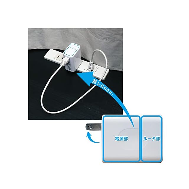 ホテル、病院、スターバックスなど、外出先の有線LANまたは無線LAN(WiFi)に接続するだけで、手軽に無線LAN環境を構築できる、コンセント直挿型無線LANルータ