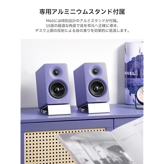 【スピーカースタンド付属】M60には専用のアルミスピーカースタンドが1ペア付属しています。これにより、デスクトップ表面からの反射による音の色の変化を効果的に軽減できます。スタンドは15度の角度で傾いており、リスニング体験をさらに最適化します。