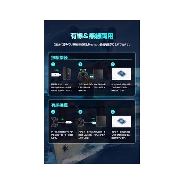 【有線&無線両用】USB有線接続が可能で、無線接続もサポートしています。Bluetooth5.0技術を採用しており、驚異的な通信速度と安定性を実現!デバイス検索や信号遅延によるゲーム操作への影響を軽減します。※注意:コントローラーの機種によって無線接続方法が異なる場合があるため、使用前には取扱説明書をご確認ください。