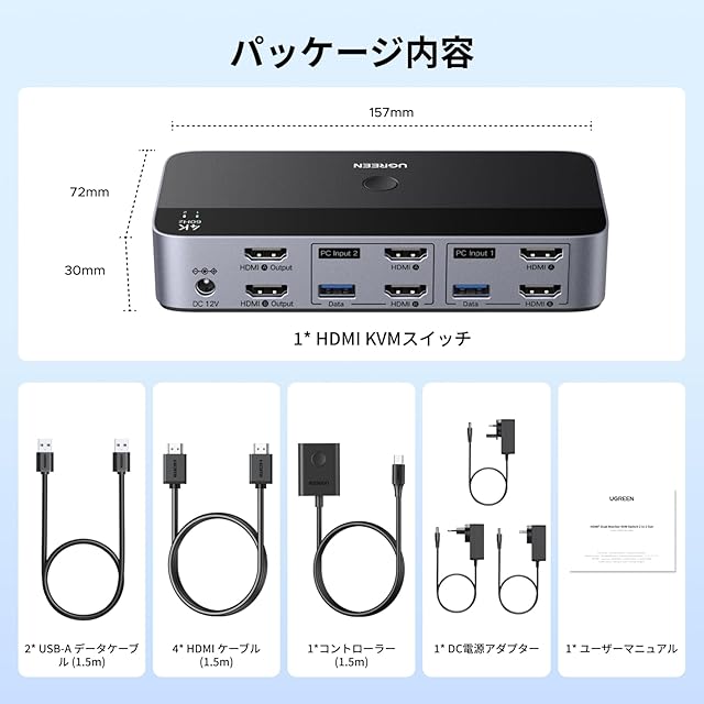 商品名:UGREEN HDMI KVM切替器 4K@60Hz 2モニタ2コンピュータ、2入力2出力スイッチ、 4つのUSB 3.0ポートのため2台のコンピュータで2モニタ/キーボード/マウス/プリンタを共有 HDMIケーブル4本、USBケーブル2本、電源アダプター、コントローラ付き