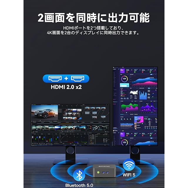 ④【2画面同時出力(4K@60Hz)】4K映像出力可能なHDMIポートを搭載、2台のモニターを4K画質で同時出力できるミニPC。また、従来より約3倍高速の次世代通信規格「Wi-Fi5」に対応し、最大12台のデバイスが同時通信可能。インターネットや動画、写真を4K UHD大画面で楽しめるほか、在宅勤務用ミニPCとしても最適。安定した接続とスムーズな操作性で、エンタメにも仕事にも頼れるミニPCです。