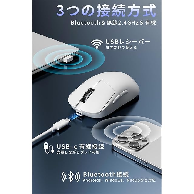 【ワイヤレスゲーミングマウス】超低遅延かつ安定したワイヤレス接続:独自のワイヤレステクノロジーを搭載しており、超低遅延かつ安定したワイヤレス接続を実現し、Bluetooth、2.4GHzワイヤレス接続と有線接続をシームレスに切り替えることが可能です。