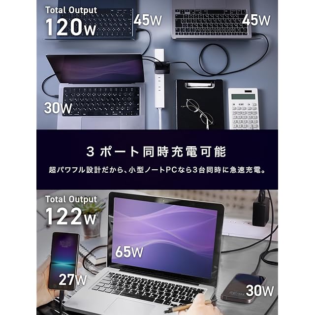 【3ポート搭載】USB-C×3ポート搭載。2ポート使用時は65WクラスのノートPCを2台同時に、3ポート使用時は30Wクラスであれば3台同時に充電が可能です。スマートフォン(iPhoneやAndroid)からタブレット(iPad)、ノートPC(Macbook、Windows PC等)まで幅広い機器に対応しています。※詳しくは急速充電早見表(画像)をご確認ください。