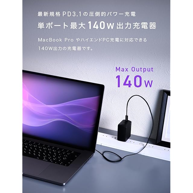 USB-C単ポート最大出力140W PD3.1(USB PD Extended Power Range(EPR))規格準拠でApple Macbook ProやWindowsノートパソコンへの充電に最適充電器です。