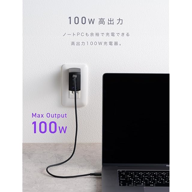 USB-C単ポート最大出力100W PD規格準拠でApple Macbook ProやWindowsノートパソコンへの充電に最適な充電器です。 スマートフォン(iPhoneやAndroid)からタブレット(iPad向け)、ノートPC(Macbook、Windows PC等)まで幅広い機器に対応しており、これ一つでご自宅でも外出先でも快適にご利用いただけます。