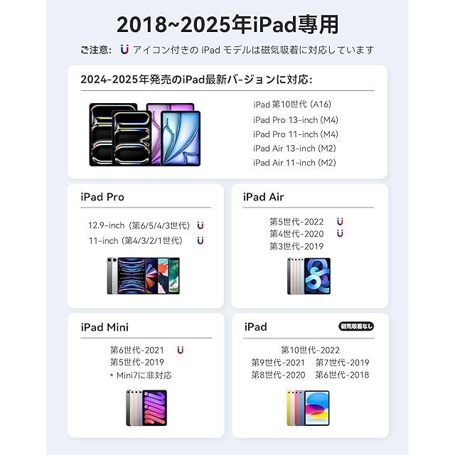 ・iPad mini7に非対応・Metapen アップル ペンシル A11は、2018年以降のiPadモデルとの完璧な組み合わせで、デジタルクリエイティブをサポートします。A11対応デバイス:iPad 第6/7/8/9/10世代、iPad Air 第3/4/5世代、iPad Pro 11インチ第1/2/3/4世代、iPad Pro 12.9インチ 第3/4/5/6世代、iPad Mini第5/6世代、 iPad Pro 13/11 inch(M4)、iPad Air 13/11 inch(M2) 。ご注文の前にデバイスを確認してください、他のモデルは無効です。