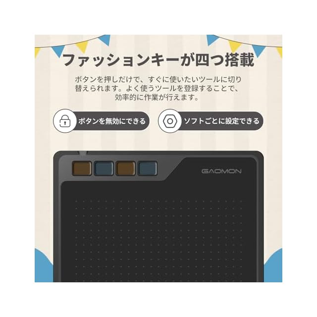 【4ショートカットキー+2ペンボタン】--あなたの創作習慣に基づいて4個ショートカットキーとペンボタンを好きな機能に設定できて、作業中にそれらを使用すると効率が大幅に向上されます。