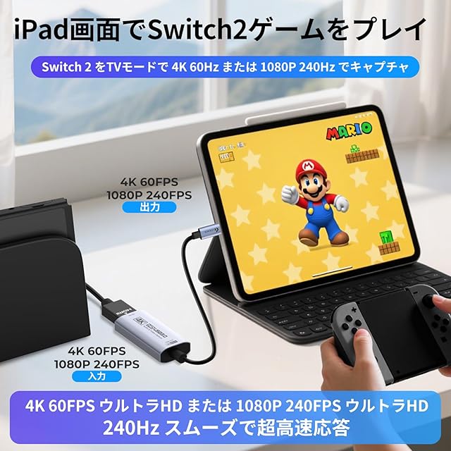 商品名:Guermok HDMIキャプチャカード 4K@60FPS、1080P@240FPS USB 3.0 HDMIからUSB A/Cビデオキャプチャカード、ストリーミング用、iPad、Switch 2/1、PS5/4、Xbox、Quest 3、Mac OS、Windows、Zoom、OBS、カメラで動作