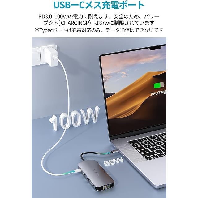 【PD急速充電】PD対応のType C充電ポートは最大100Wの給電を可能で、ハブを使いながらパソコンに充電できます。逆電流保護、過大電流衝撃保護、電圧過負荷保護等の多重保護機能があるので、安心に利用できます。PD充電ポートがあるので、充電ながらほかのポートが使用でき、ノートパソコンの機能も拡張します。