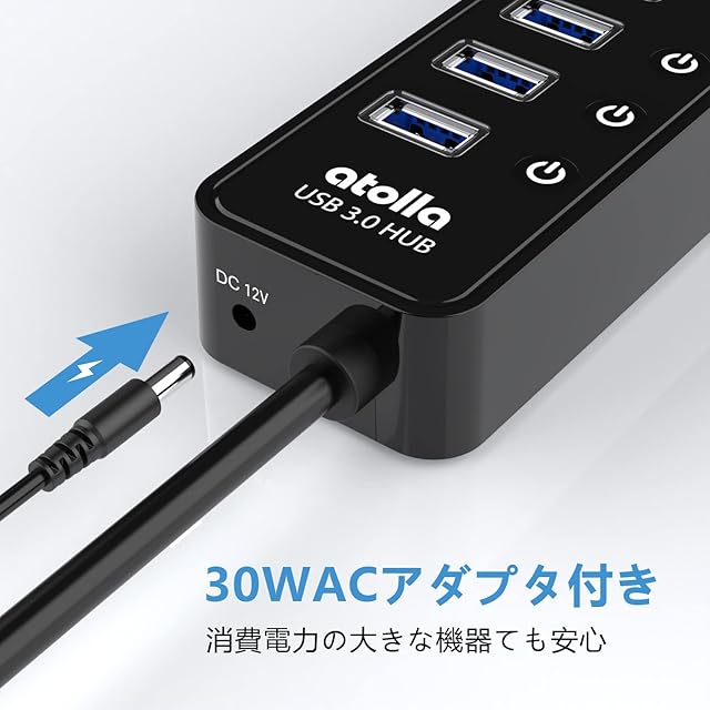 商品名:USB3.0ハブ 電源付き atolla USB ハブ 10ポート USBハブ セルフパワー/バスパワー USB Hub 5Gbps高速データ伝送 USB3.0 拡張 独立スイッチ付き 12V/2.5A ACアダプタ付き Android/Windows/MacBook/Mac/Surface Pro等システムとノートPC対応