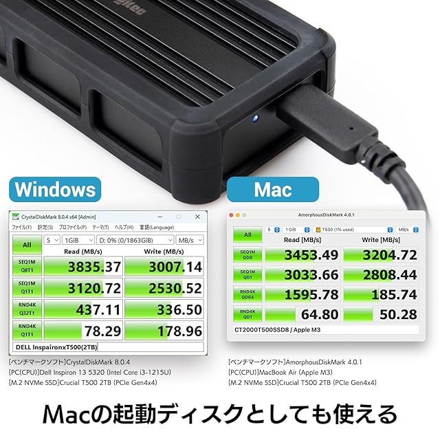 【Macの起動ディスクとしても使える最大3,800MB/sの超高速データ転送】最新のWindows11やmacOS Sonomaに対応。読み込み最大3,800MB/s、書き込み最大3,000MB/sを実現。内蔵SSDと同等のスピードでMacOSのインストール、外部起動ディスクとして使用できるので、従来の外付けSSDよりも作業効率が向上します。また、システム全体のバックアップや他のデバイスへのデータ移行も高速に行えます。