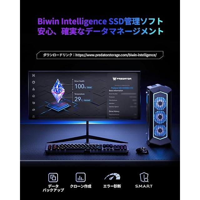 【Biwin Intelligenceソフト付き】Biwin Intelligence は、高性能SSD向けに開発された多機能管理ソフトです。データバックアップ、クローン作成、システム復元、S.M.A.R.T.、エラー診断などさらに幅広い機能を備え、SSDの管理を簡単かつ効率的に行うことができます。