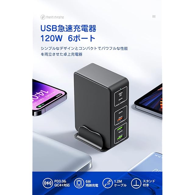 商品名:USB 充電器 type-c 合計120W PD 急速充電器 6ポート【PD 3.0、PPS、QC4+対応/単ポート65W/6台同時充電/1.2Mケーブル&スタンド付】USB-C*3&USB-A*3 スマホ充電器 PSE認証済み MacBook Windows PC iPad iPhone Galaxy Android スマートフォン タブレットノートPC などその他機器対応