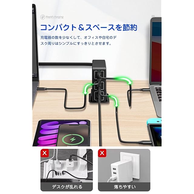 【1.2Mケーブル&スタンド付】1.2メートルのAC入力ケーブルから給電して、コンセントから離れた場所も利用可能です。自宅でもオフィスでも適用し、省スペースを実現した上に机をスッキリさせる卓上急速充電器です。スタンド付きでデスクの上に置いても倒れにくいです。もちろん、スタンドを使わず、横置きで使用することもできます。