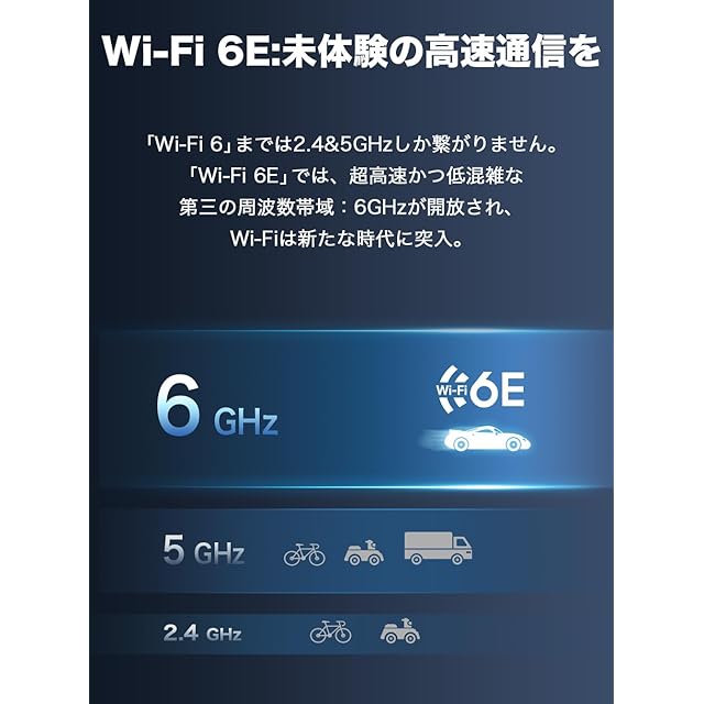 [規格値] Wi-Fi6E対応: 2402 Mbps (6 GHz) + 2402 Mbps (5 GHz) + 574 Mbps (2.4 GHz)