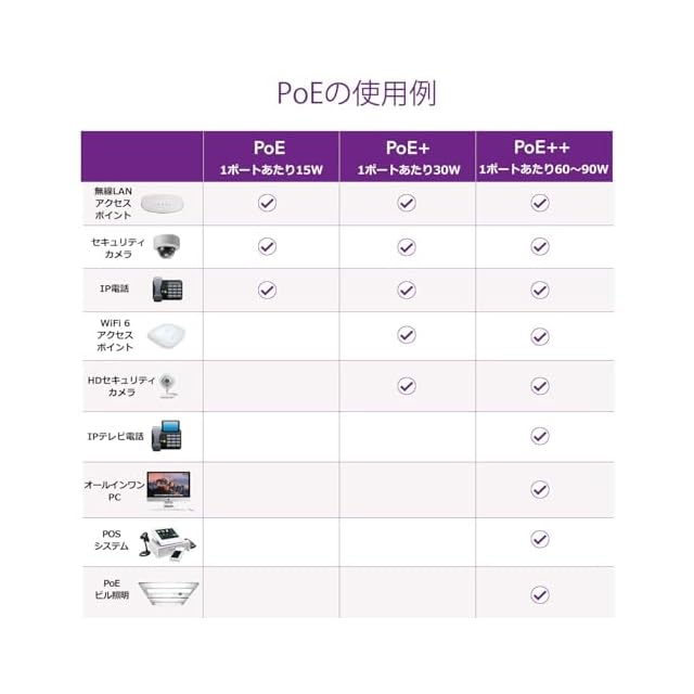 PoE受電が必要な無線LANアクセスポイントやIP監視カメラ、IP電話機の収容に最適。