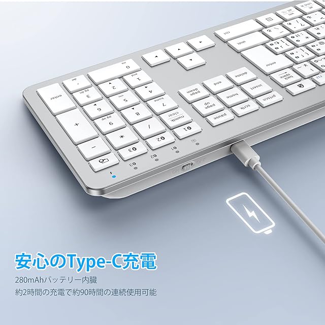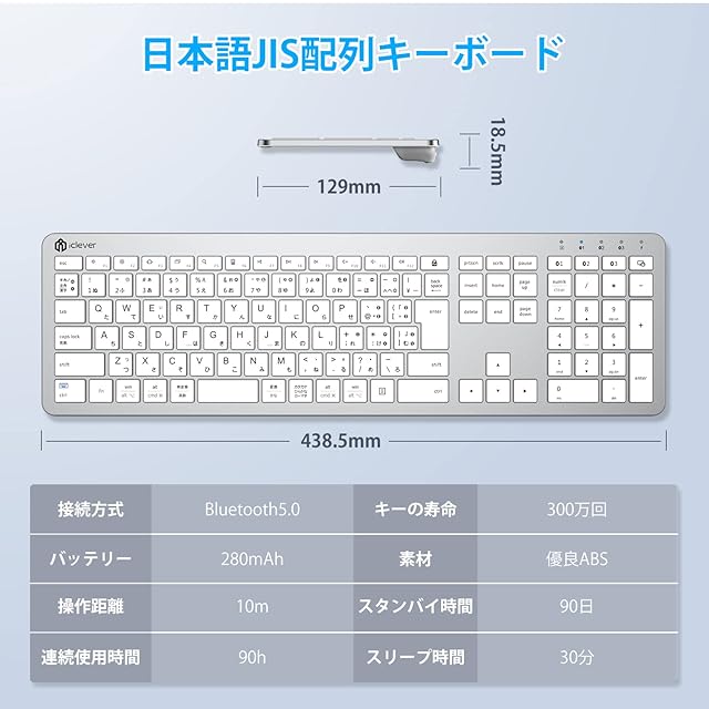 iClever キーボード Bluetooth5.1 ワイヤレス JIS配列 マルチペアリング Type-C充電式 122h長時間連続使用フルサイズ PCタブレットスマホ コンピーター用 Windows/iOS/Mac/Android対応 OS自動識別 テンキー付き IC-BK31 シルバーホワイト