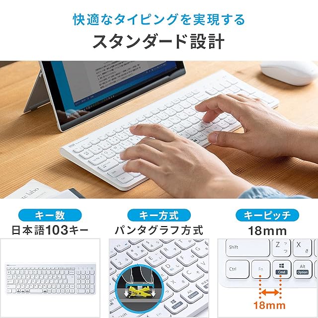 【キーボード仕様】打鍵しやすい標準の18mmキーピッチと、日本語109A配列を基にした配列を採用しています。キー方式はノートPCに多く採用されている パンタグラフ式 です。