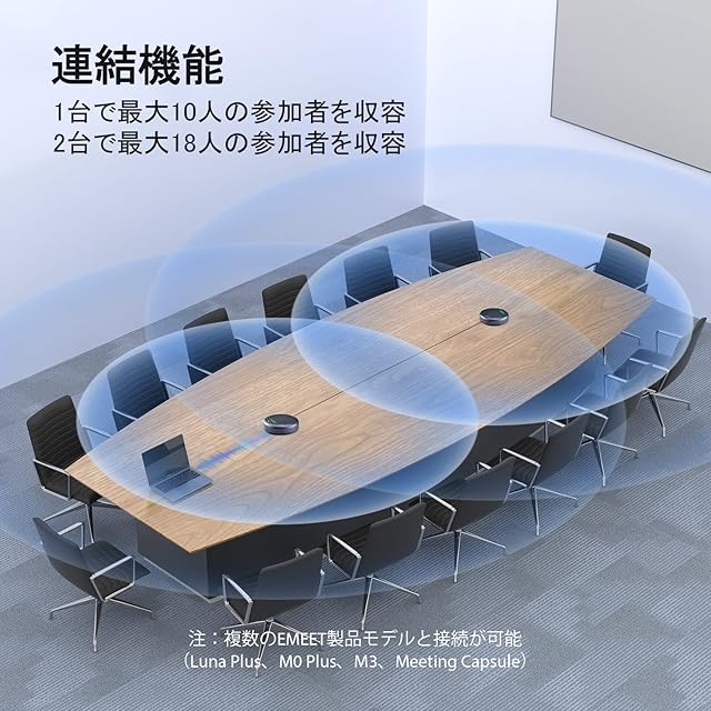 【18名まで対応可能な連結機能】 EMEET Luna Plus会議用スピーカーは、連結機能を搭載しており、会議室など様々なシーンに対応した拡張が可能です。EMEETの専用連結ケーブルを使って会議用スピーカーフォンを接続し、18人まで参加可能な会議をサポートできます。会議用スピーカーの有線接続技術は、無線接続とは異なり、安定した接続をし、干渉のない通話を実現します。