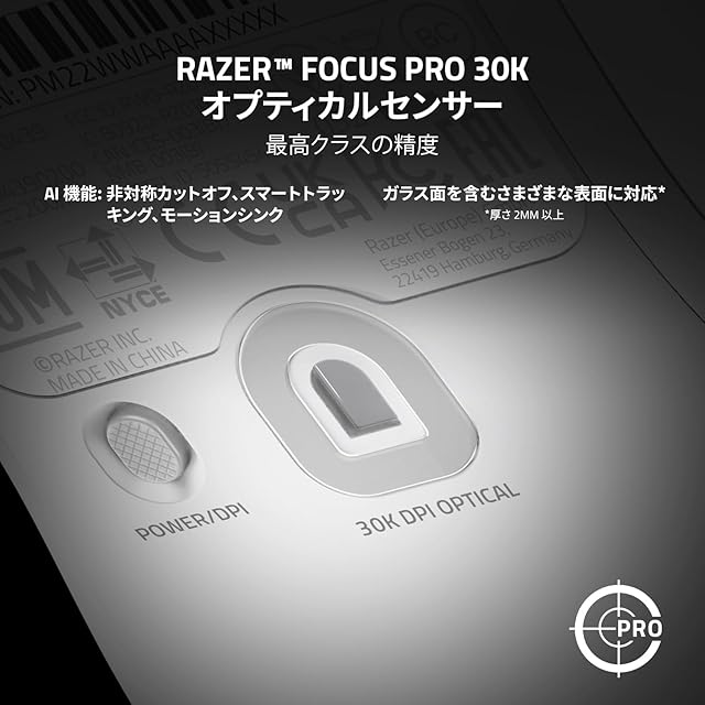 【Razer Focus Pro 30K オプティカルセンサー】前モデルのセンサーより正確なトラッキング/進化したAI機能/ガラス表面にも対応と、究極までに洗礼されたセンサーとなっており、より高い精度でのマウス操作が可能になっています。