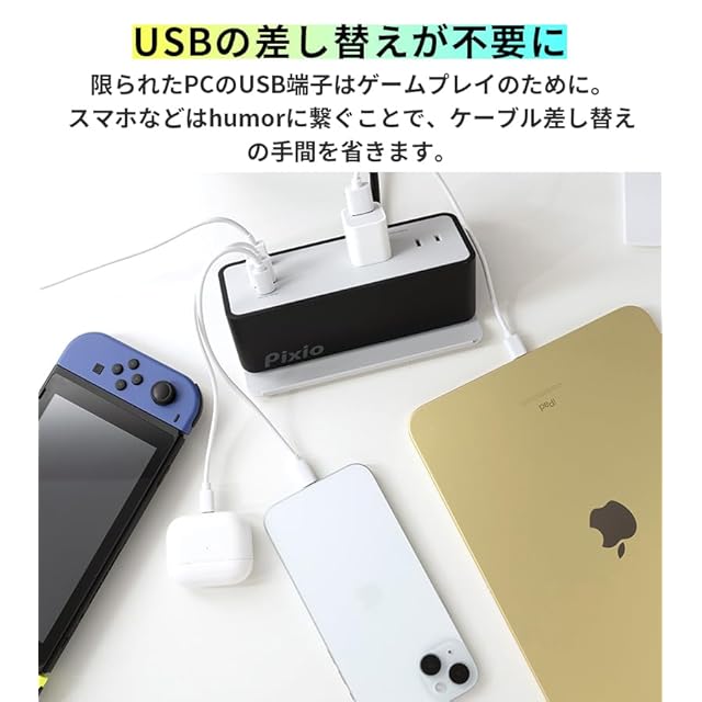 デスク周りをスッキリ!複数のデジタルデバイスを一括チャージできる充電ステーションです。ケーブルだらけでごちゃごちゃしたデスク周りをスッキリ、使いやすく、スタイリッシュに。ゲームプレイに関わらない機器はPCから外して接続することで、毎回差し替える手間が省けます。PCの位置によって発生するケーブルの混線から解放!・USB Type-Cの出力が30W&PD対応になったことで急速充電が可能・底面に滑り止め完備・動画視聴に便利なスタンド機能(スマホの縦・横置き、タブレットの横置き対応)・USB Type-A・USB Type-C・ACコンセントの3種類のポート・デスク上に置いても十分な1.5mの本体コード