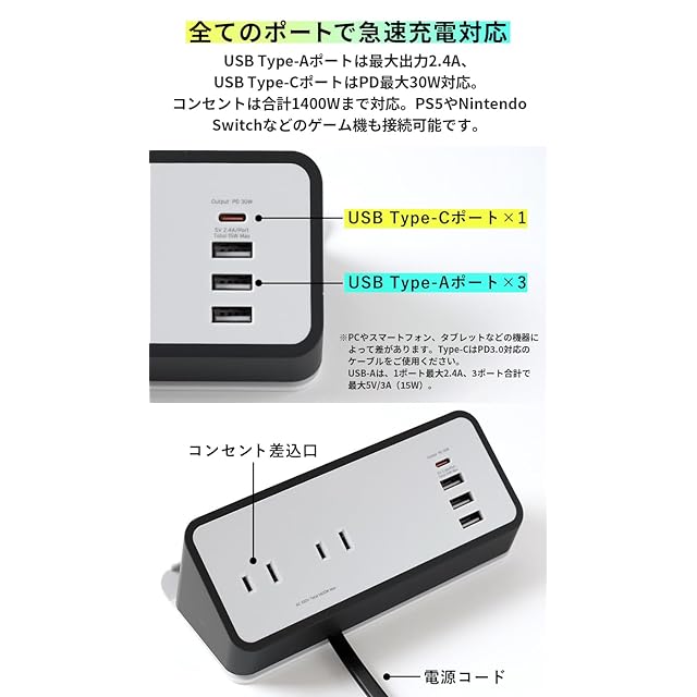 充電口を正面から上部に持ってくることで、使用中でもスッキリとした見た目に・PCをどこに設置してもケーブルの混線から解放・USB Type-Cの出力が30W&PD対応になったことで急速充電が可能・インテリアに馴染みやすいコンパクト設計・底面に滑り止め完備・動画視聴に便利なスタンド機能(スマホの縦・横置き、タブレットの横置き対応)・USB Type-A・USB Type-C・ACコンセントの3種類のポート・デスク上に置いても十分な1.5mの本体コード